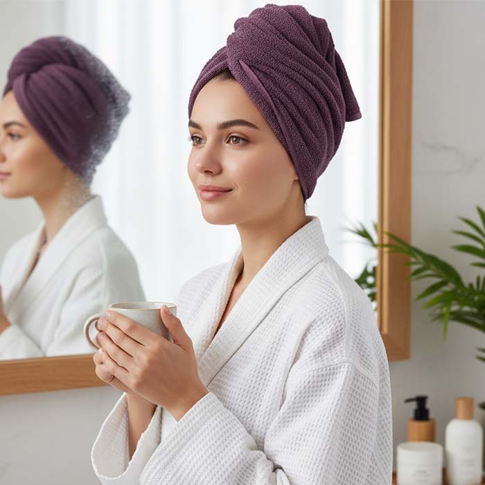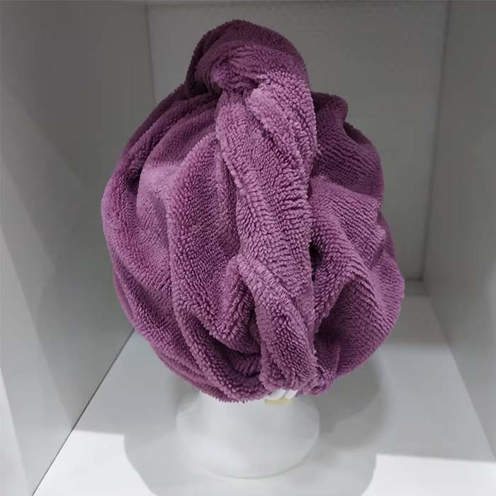 Angenehm tragbarer Handtuchturban. Vor allem bei langen Haaren kann man diesen komfortabel wickeln ohne, dass beim Wickeln Haare hinten, an den Seiten oder vorne heraus rutschen. Er lässt sich hinten mit Schlaufe und Knopf verschließen.