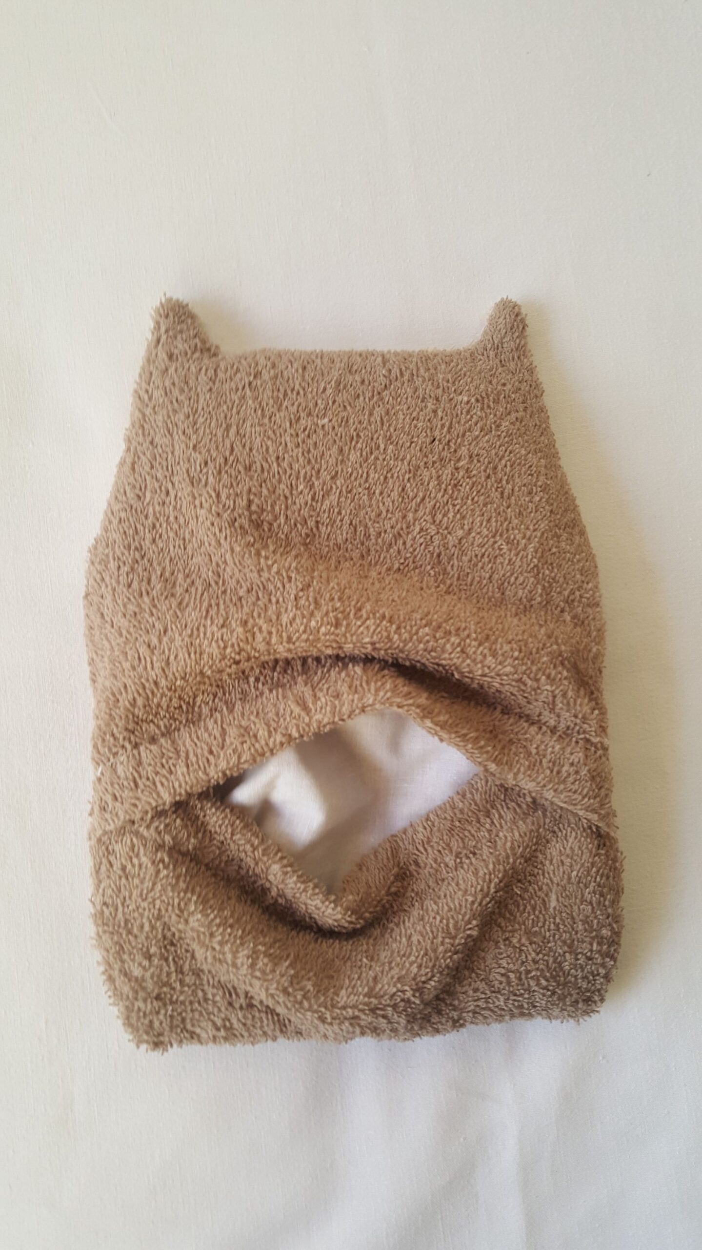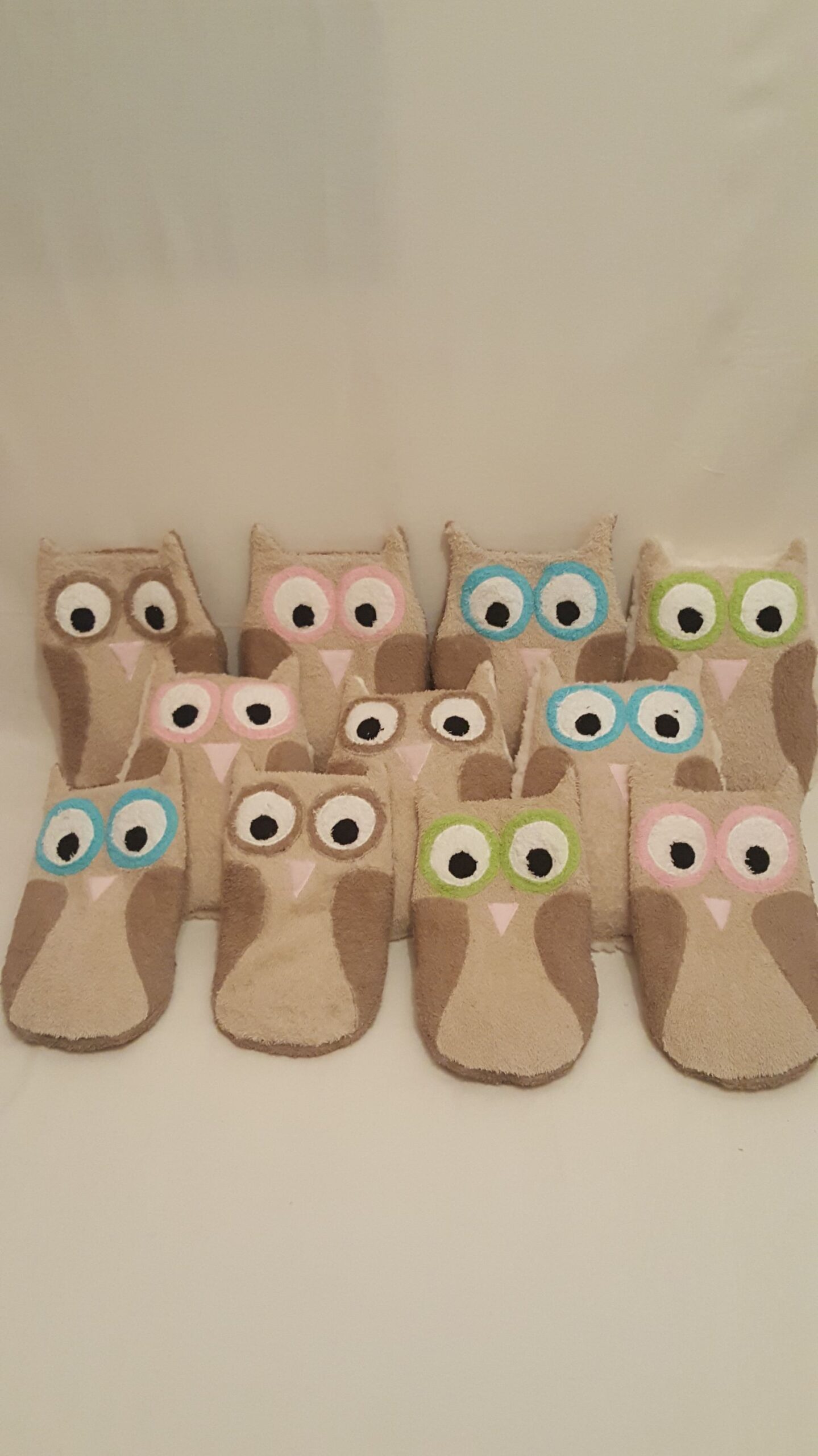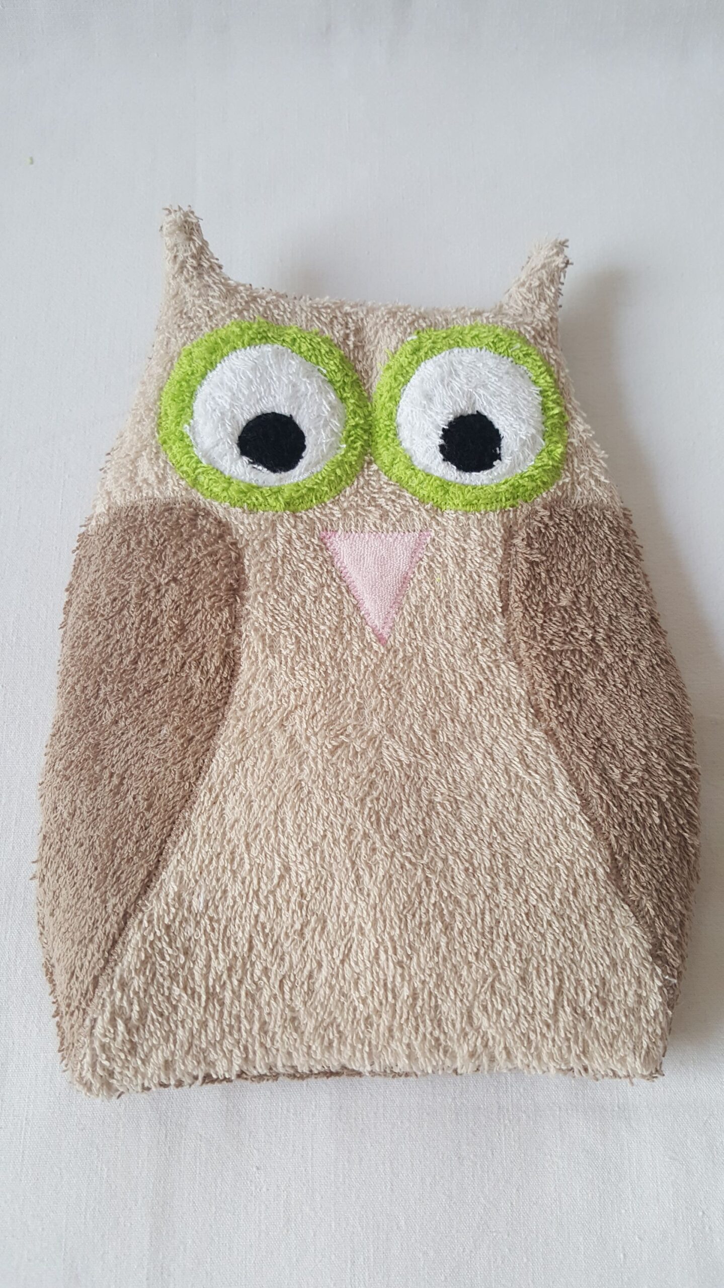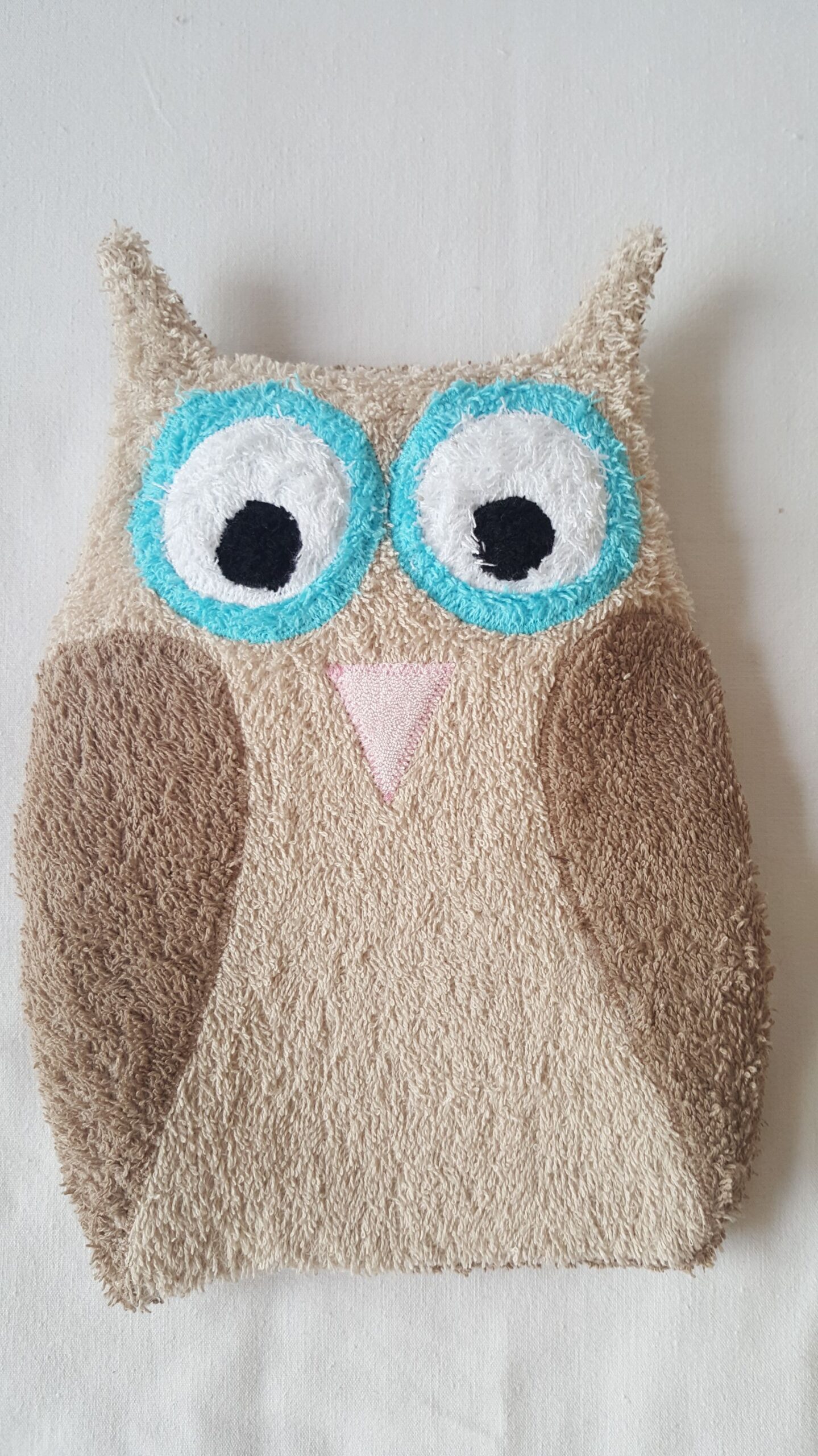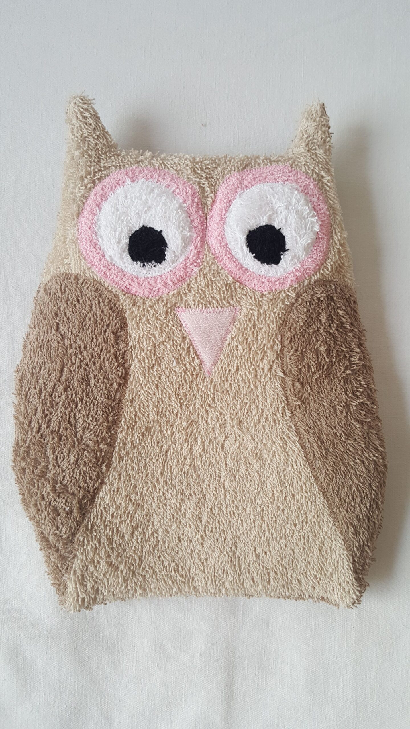 Der Körper, sowie die Augen und die Flügel sind aus Baumwollfrottee und der Schnabel ist aus rosa Plüschstoff. Auf der Rückseite ist die Eule mit einem Hotelverschluss geschlossen, sodass man das Körnerkisseninlett aus der Eule zum erwärmen nehmen kann.