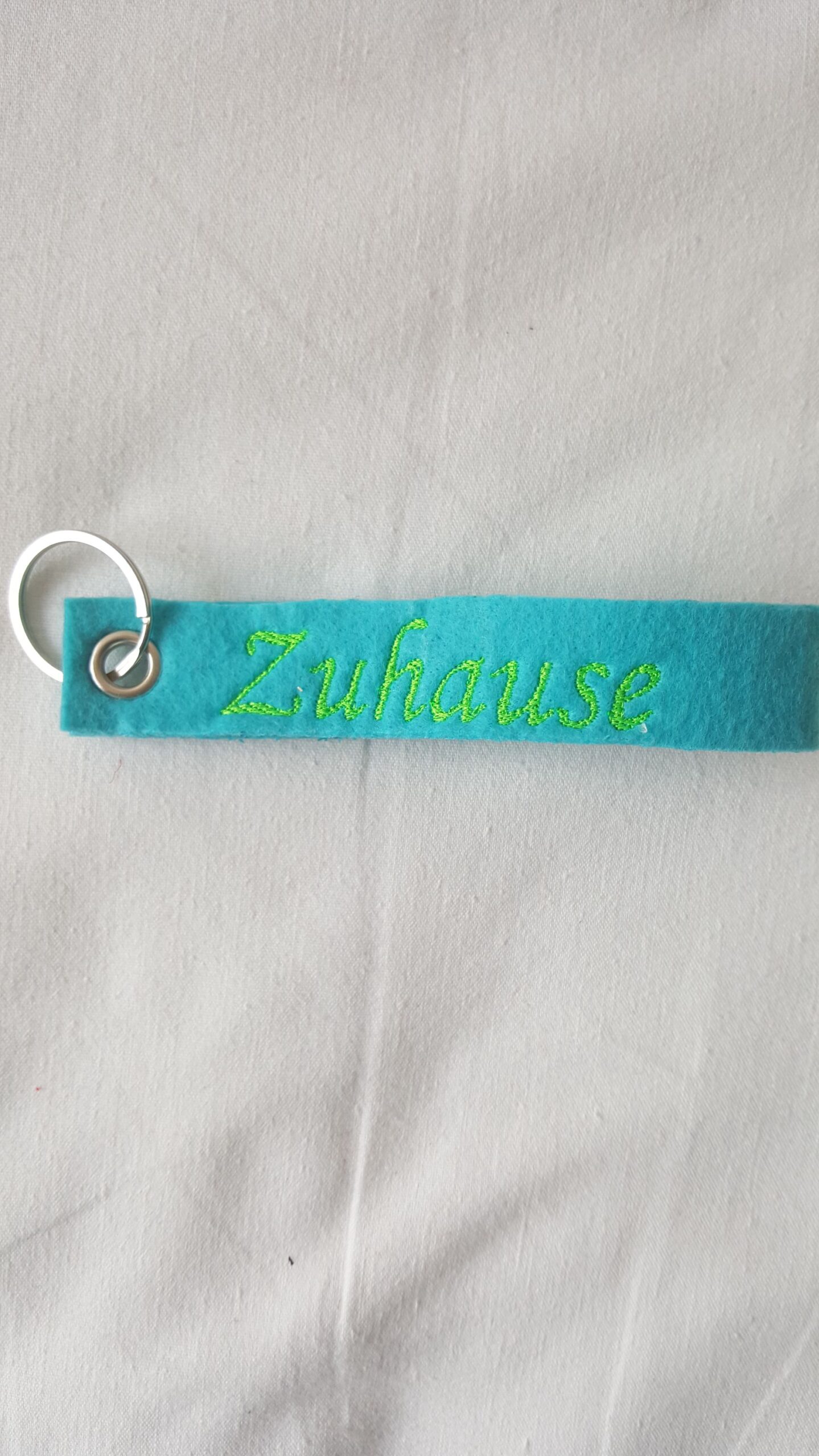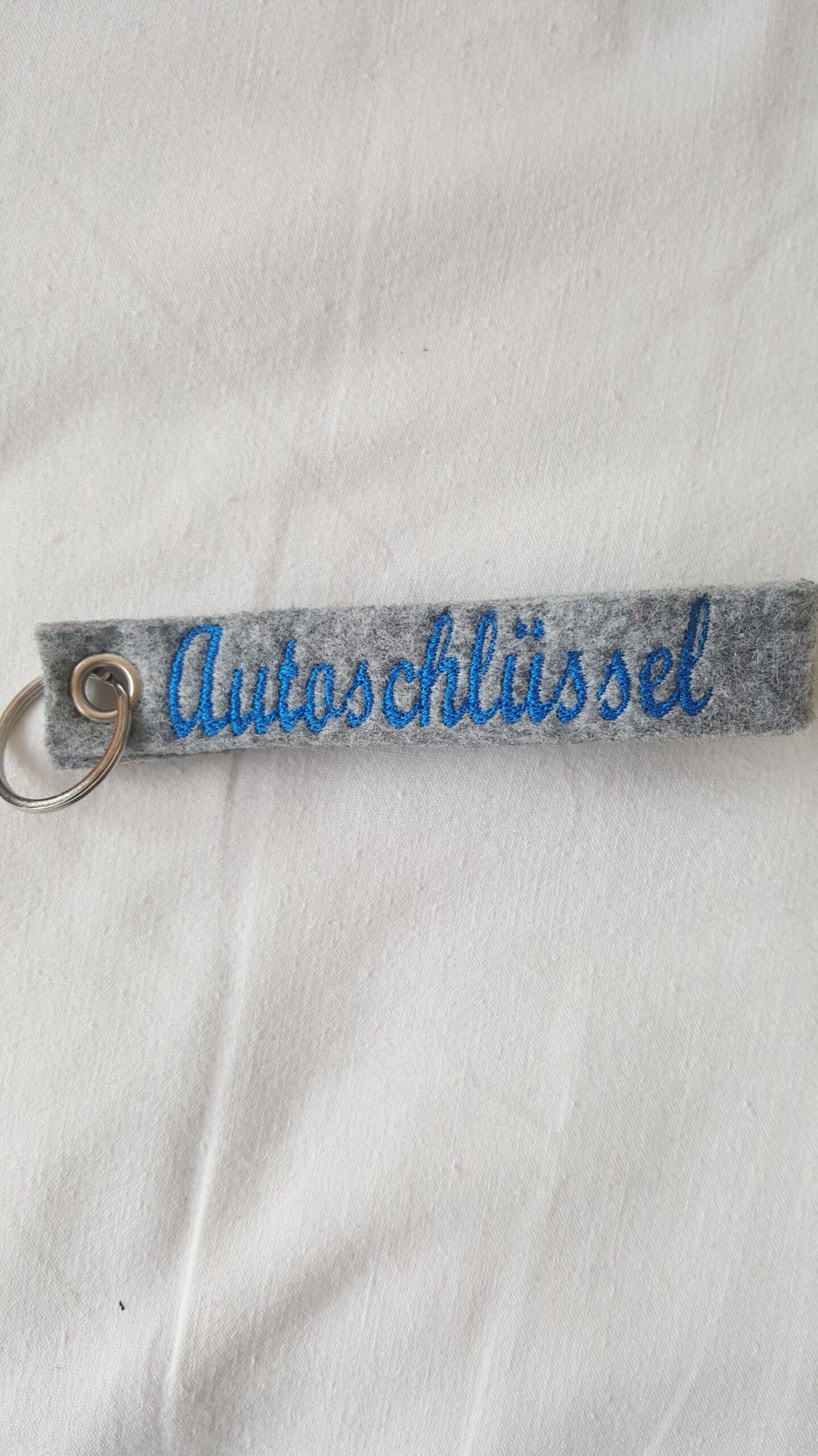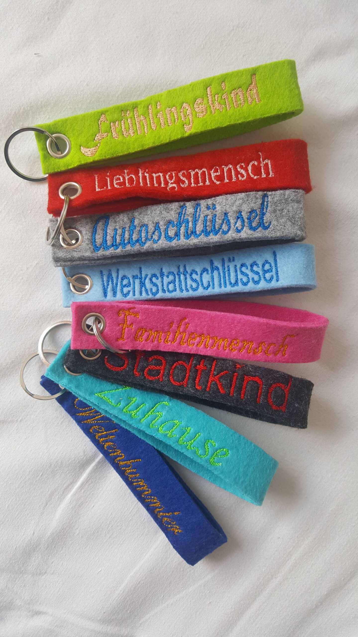 Lange Schlüsselbänder zur individuellen Bestickung. Ob mit dem Rufnamen, Autokennzeichen, Spielernamen oder dem Kosenamen des Partners – der Fantasie sind hier keine Grenzen gesetzt.